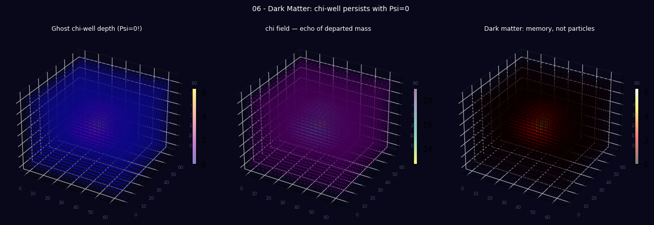 06 – Dark Matter ======================================================= After equilibration: χ_min = 16.423 (well depth = 2.577) After 2000 steps (matter present): χ_min = 14.891 (well depth = 4.109) >>> All Ψ zeroed – matter is gone. +1000 steps after removal: χ_min = 14.902 (well depth = 4.098) +2000 steps after removal: χ_min = 14.977 (well depth = 3.023) +3000 steps after removal: χ_min = 15.308 (well depth = 3.692) +4000 steps after removal: χ_min = 15.641 (well depth = 3.359) +5000 steps after removal: χ_min = 15.912 (well depth = 3.088) The χ-well persists even with zero matter. χ-well memory persists with Ψ = 0 — an analog of dark matter, without new particles.